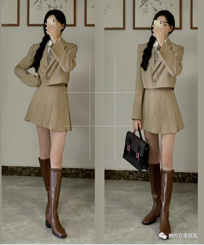 这套衣服整体属于传统校园英伦风,白色上衣打一个领带搭配短款的西装,下面搭一个百褶裙和一个长筒高跟鞋,一下把气质提高了很多。