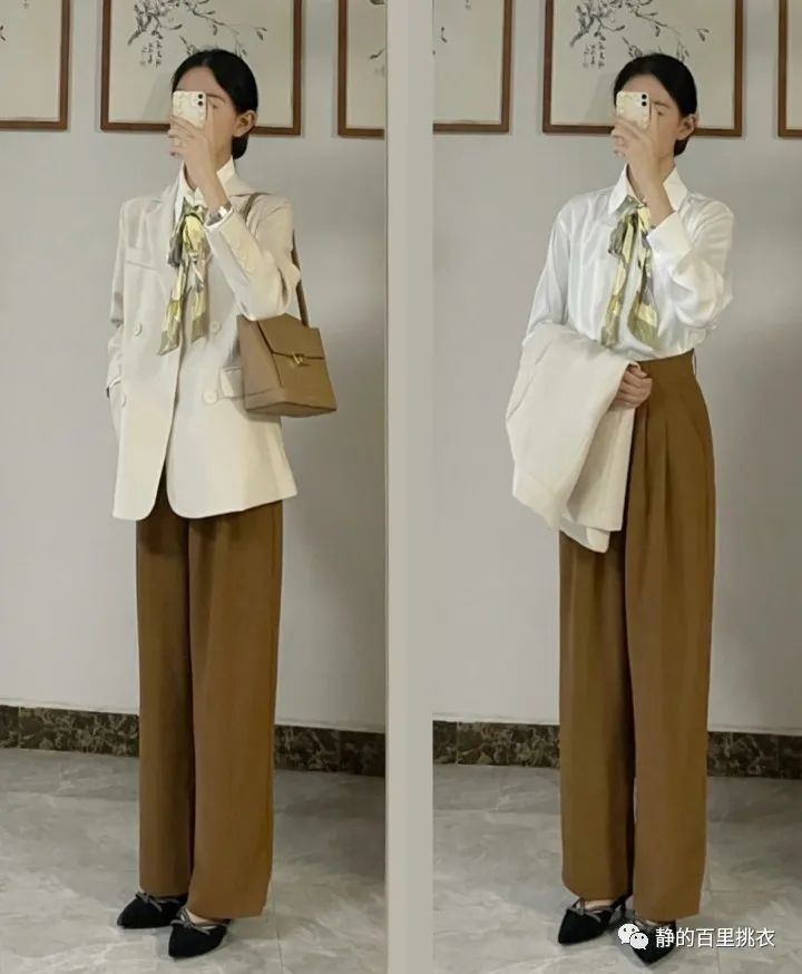 亮白色衬衫配上一条浅绿色的丝巾,与棕色直筒裤和尖头高跟鞋,让整个人看起来不仅有气质也不失职业范。