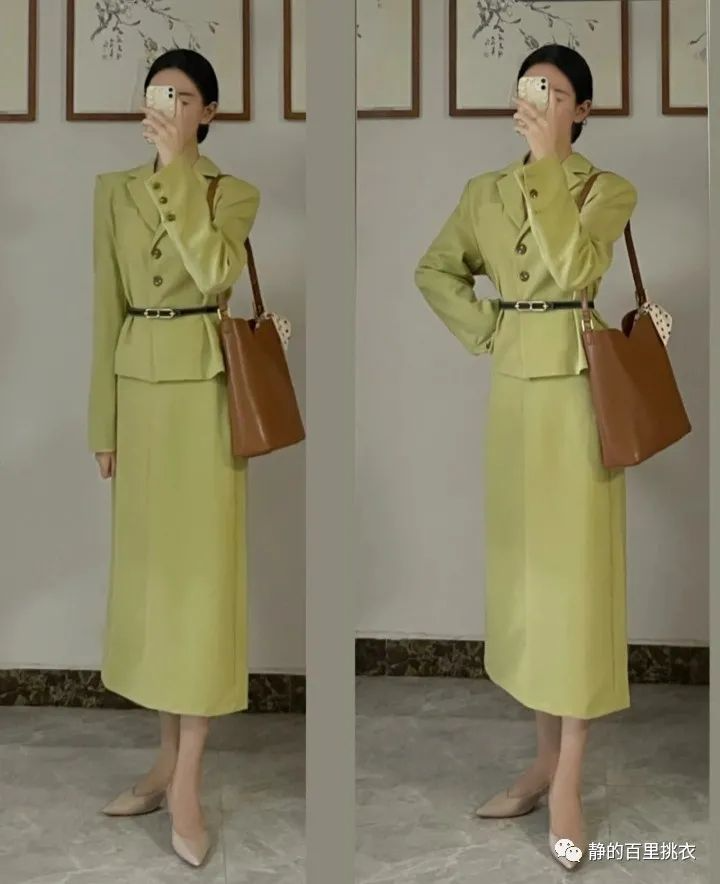 这套衣服看起来比较有气场,给人营造一种女强人的感觉。通身为橄榄色,上身是一个黑腰带束身的西服,配上一个直筒长裙,层次感分明,同时显出好身材。
