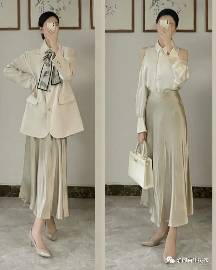 这套衣服偏甜美温柔,露肩式的米色衬衫,外面搭配一个米白色的西服,系上一个优雅的丝带。下半身则采用绸缎式的裙子,让整个人看起来更加优雅。