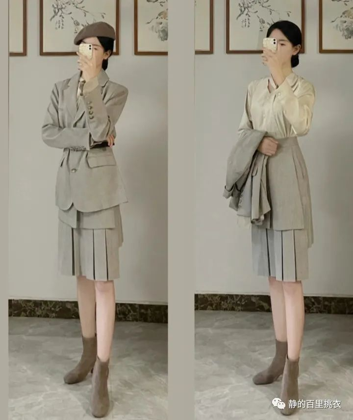并且整体颜色为浅咖色的套装,衬得整个人比较温和协调。
