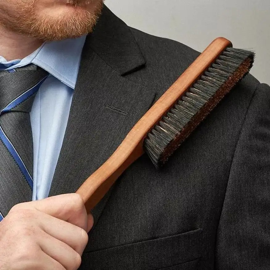 注意,要用专业的毛刷,从上往下,按照面料的纹理走势轻轻地刷,领子后面以及腋下也要刷到。刷完之后,要轻抖一下。