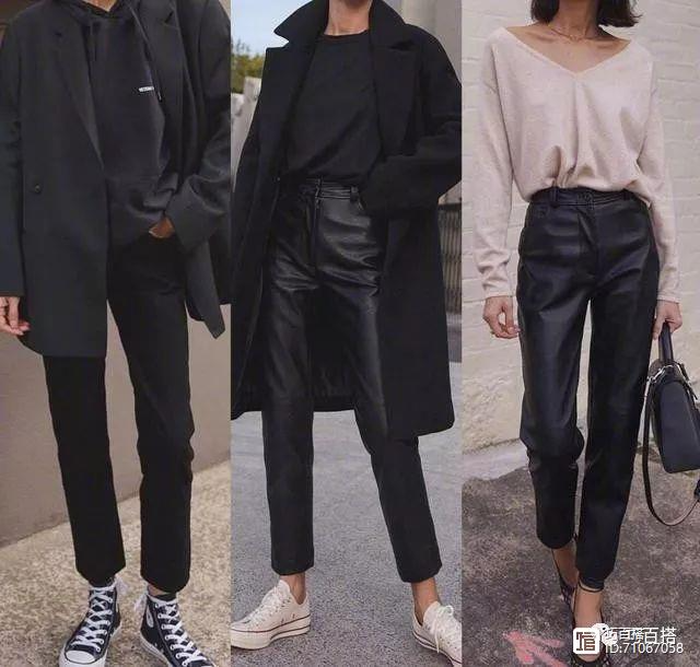 出镜率最高的裤装除了牛仔裤之外就是小黑裤了,小黑裤的材质分为普通的哑光面料,还有光泽感的皮裤,因为皮裤冬季穿着非常的保暖所以受到很多的青睐。