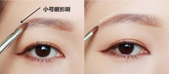 对于化妆新手小白来说,用眉笔很容易下手过重变成蜡笔小新了。这里告诉你们,在画好眉形之后,可以用小号的眼影刷,沾取眉粉或者是眉笔去进行眉毛的填充,这样画出来的眉毛更自然均匀,也不会那么突兀了▼