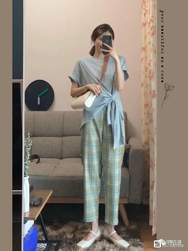 T恤衫衬衫等单品,如果太短就容易暴露身材的缺陷,像小肚腩等问题就会通通显现。所以身上肉肉的女生来说,并不适合运用短款打造显高效果。扭结设计或者抽绳的设计可以了解一下,是不错的选择。在某一处轻轻地揪起一个结,形成高腰线的效果,但是整体的长度是不变的,所以不仅遮肉又可以达到显高的目的。
