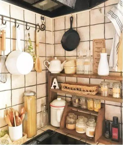 油盐酱醋、谷物粮食用统一风格的瓶罐进行收纳。