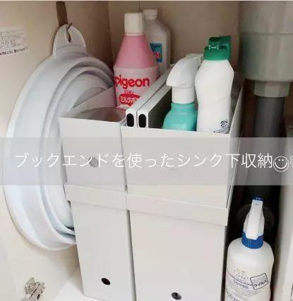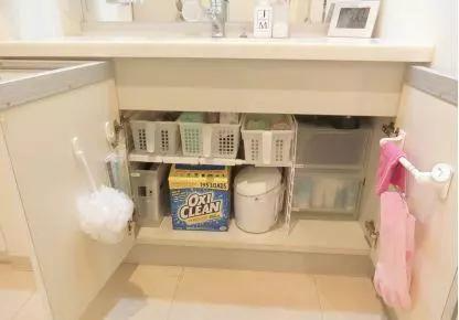 洗面台下面收纳各种清洁用品。洗衣粉洗衣液、洁厕剂、手套等等都可以塞进去。