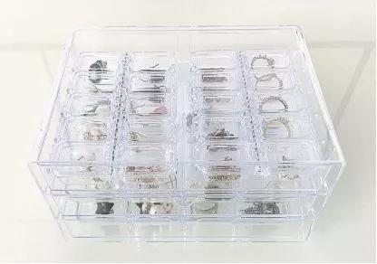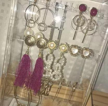 耳环、戒指、项链等小饰品收纳一般有2种方式:1.装在透明的收纳盒,2.挂起来。两种收纳方式都很不错,可以根据自己的喜好选择。