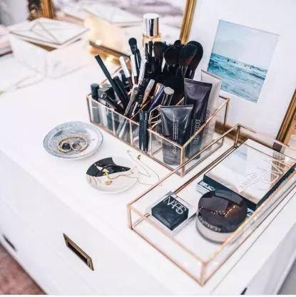 化妆品和护肤品分别装在不同的收纳盒里、按照整个面部修饰的顺序来摆放化妆品,这样每天用起来才会有条不紊~
