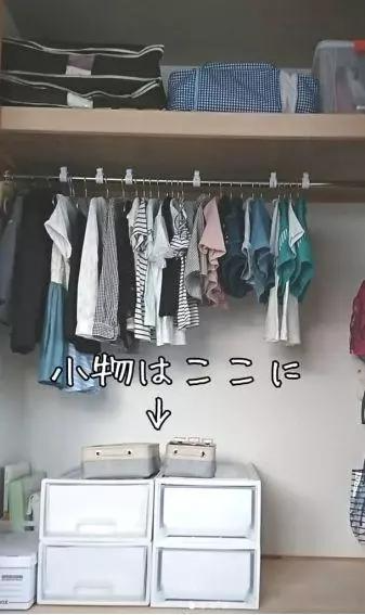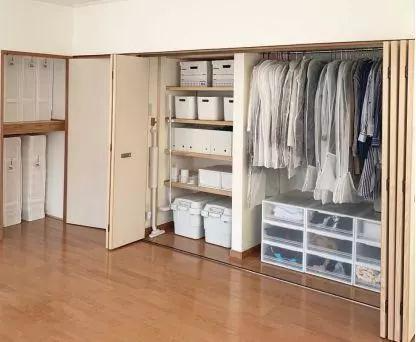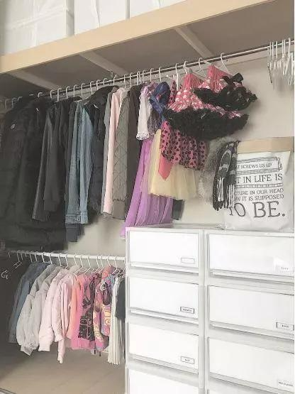 家里每位家庭成员的衣服不要混放,最好各自都有一个区域,这样真的能省去很多找衣服的时间。换季衣服被子放在收纳袋/箱或者柜子里。