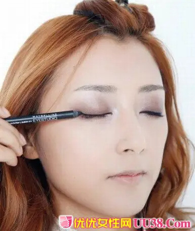 用眼线笔由里向眼尾描出细细的一条黑色眼线,拉大眼睛视觉上的效果。#p#副标题#e#