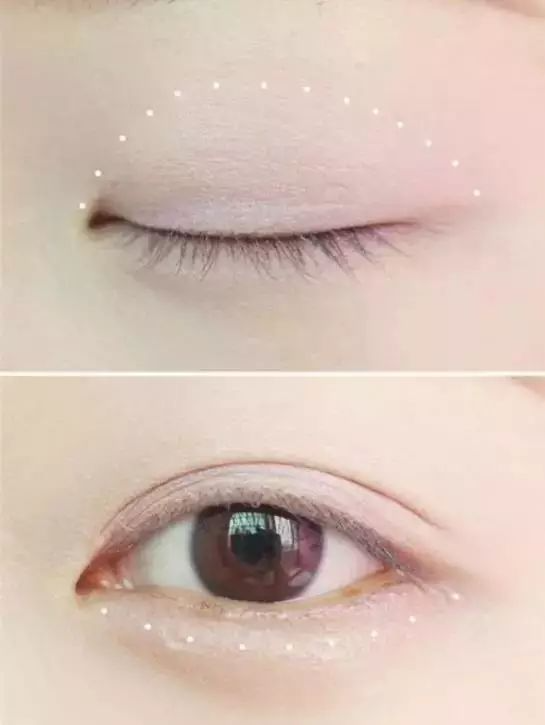 Step1:用眼影刷沾取适量带珠光的白色眼影,轻刷在上、下眼皮的白色区域内,提亮双眸。