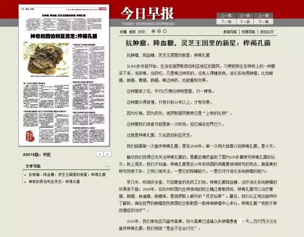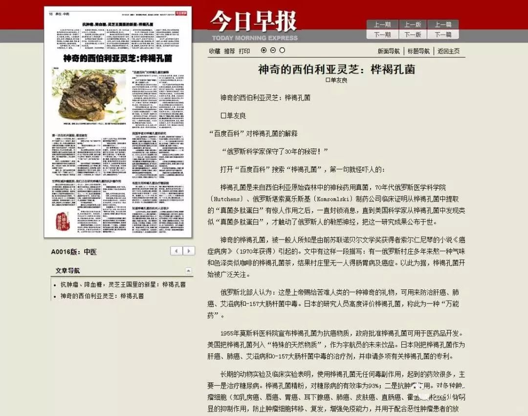 2017年“今日早报”再次力推桦褐孔菌,并进行大版面报道,让这一药用真菌更加引人注目。