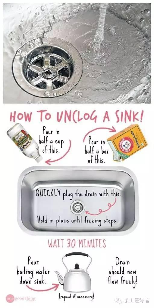疏通水槽:很多人遭遇过厨房水槽下水堵住的烦心事,这时候大概都会想起超市卖的疏通剂。这里介绍一个简单的材料更天然的方法:首先准备能够堵住下水口的一团布,先往下水里导入适量的小苏打,如果堵的厉害就多倒一些;然后一手拿着布,一手向下水倒入半杯白醋。醋和小苏打的化学反应会有“小火山”的喷发效果,所以导入白醋以后要迅速把下水口捂住。30分钟后,烧好一壶热水,沿着下水口缓缓地倒下去,管道就疏通了!