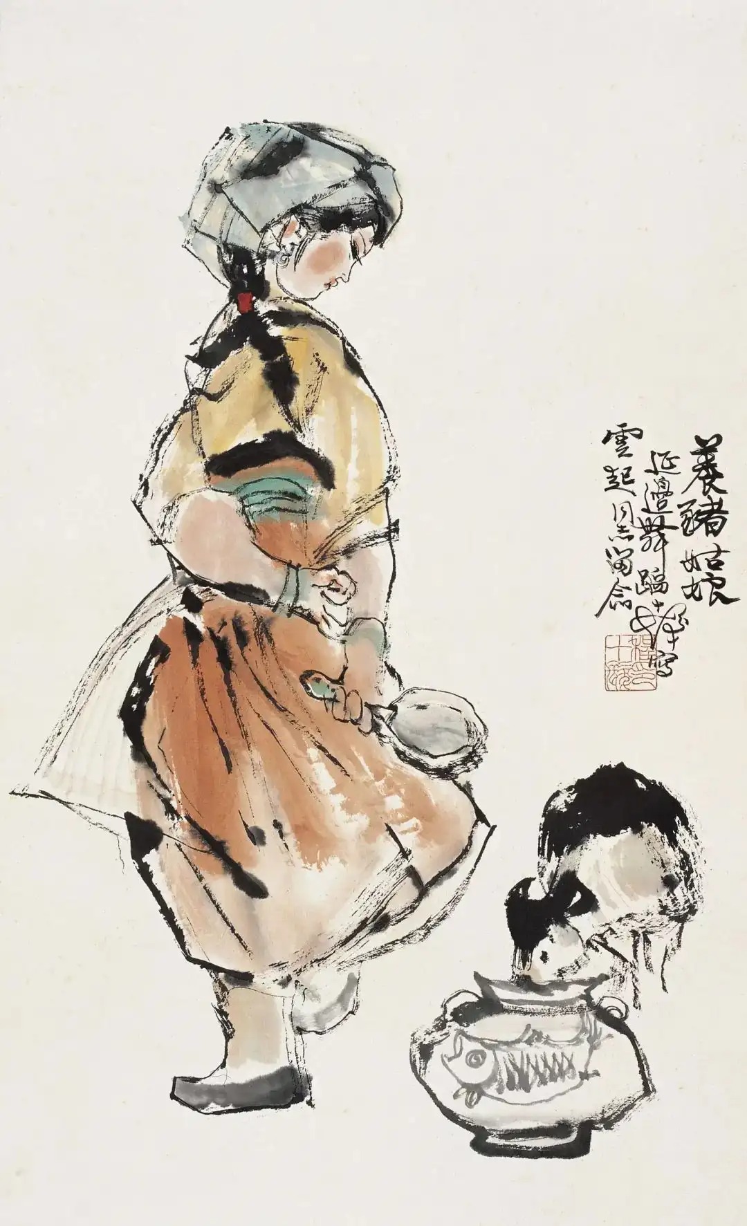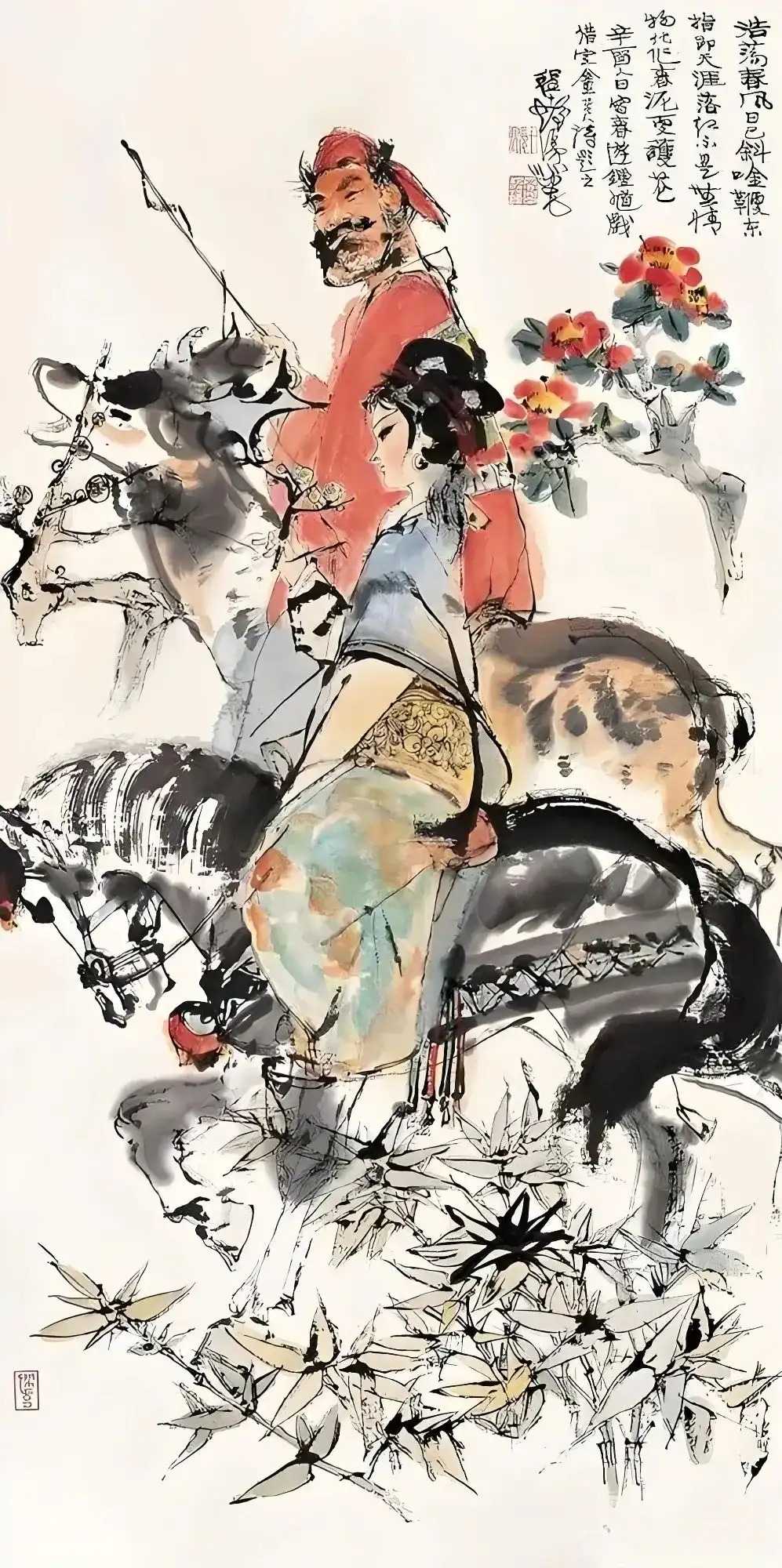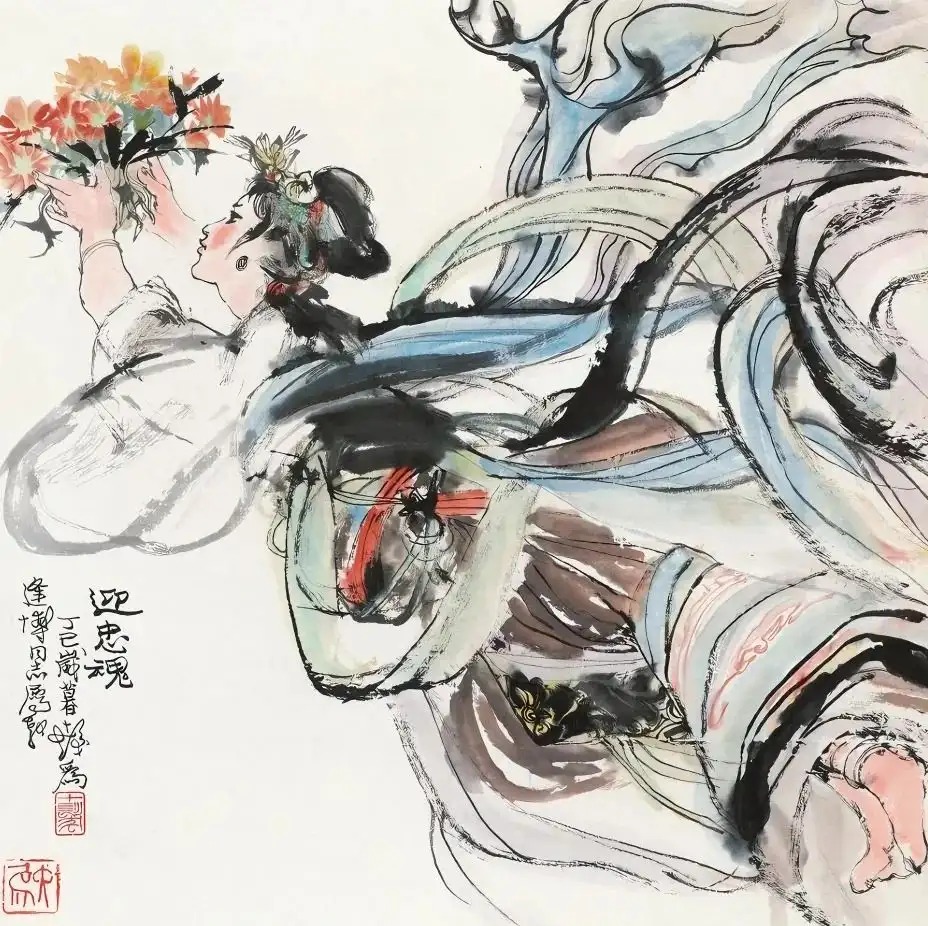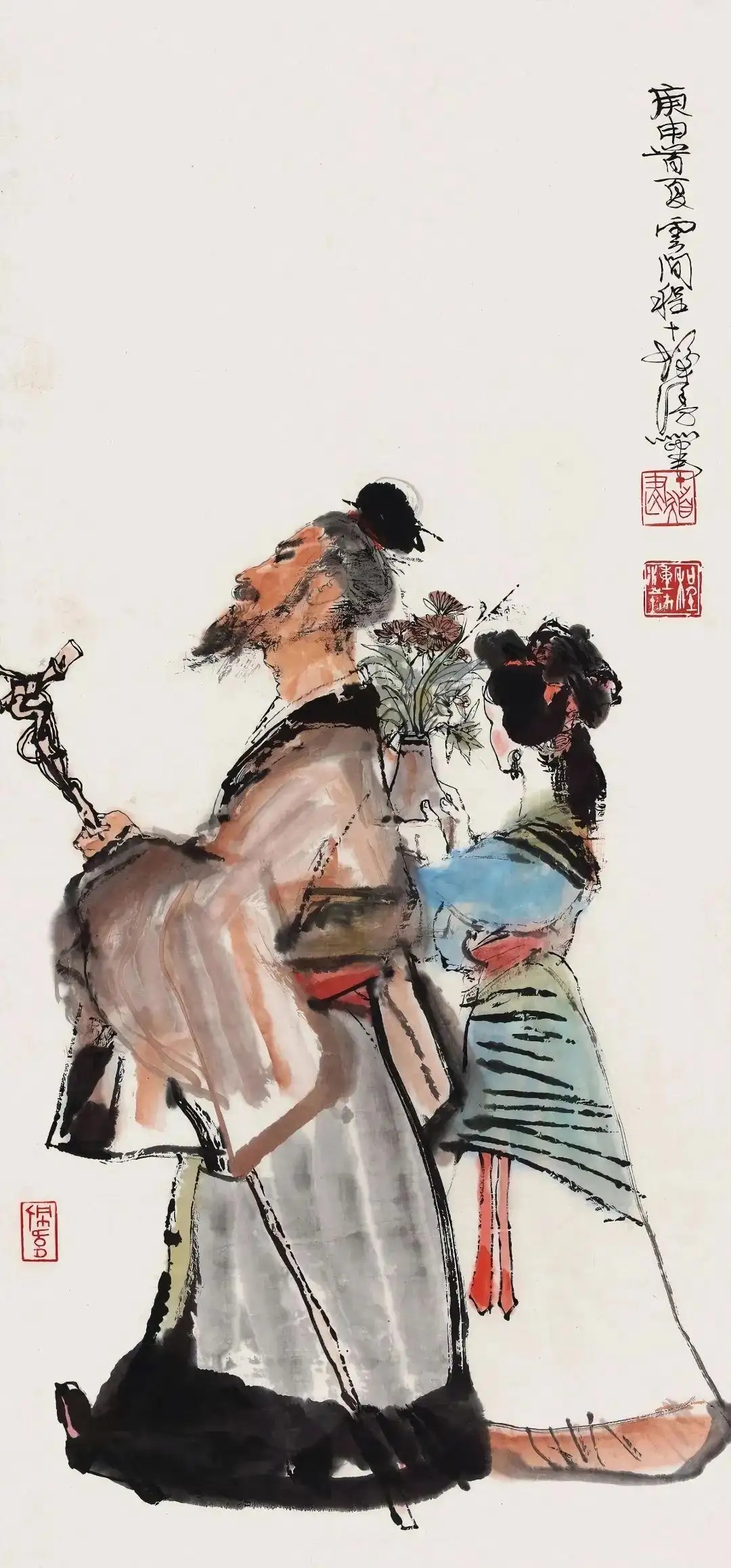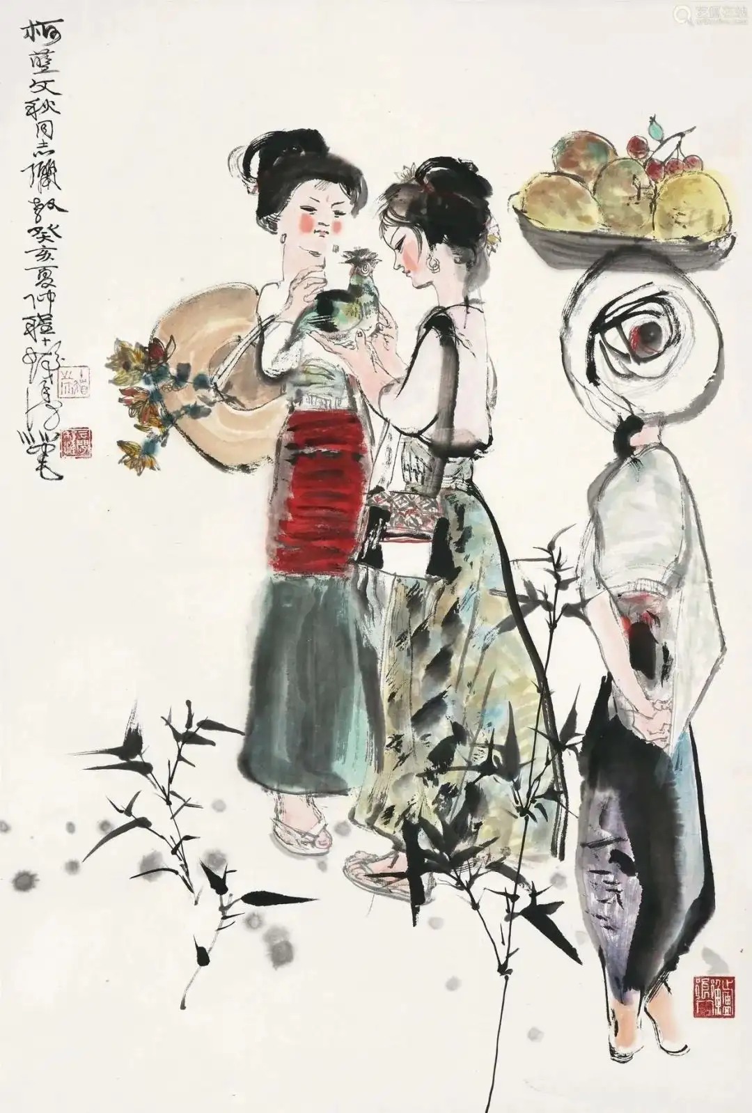 程十发(1921-2007),中国近现代美术史上独树一帜的艺术大师,其人物画以灵动飘逸的线条、明快鲜活的色彩和充满生命力的艺术表达,成为二十世纪中国画转型的重要标志。本文精选其100幅经典人物画作,带您走进这位海派艺术巨匠的笔墨世界。程十发笔下的少数民族形象,打破了传统工笔的拘谨,以写意线条勾勒出西南边陲的浪漫风情。《傣族少女》中,少女身姿如风中细柳,简练的墨色长裙与朱砂点缀的头饰形成鲜明对比,传递出热带雨林的生机;《高原之春》里藏族少女的羊皮袄以枯笔皴擦出粗犷质感,面颊的胭脂色却透出江南水乡的温婉,这正是画家'以线造型,以色传情'理念的完美诠释。在《芦笙舞》三联画中,画家大胆采用俯瞰视角,将苗家儿女的舞动身姿转化为流动的线条符号,笙管与裙摆的弧线相互呼应,构成视觉的交响乐。而《火把节》则运用泼墨技法渲染夜色,跳跃的橙色火光照亮彝族汉子的轮廓,展现出原始生命的张力。程十发对传统题材的再造令人耳目一新。《李太白醉酒图》突破历代白描范式,以倾斜构图表现诗仙的醉态,袍服上的飞白笔触仿佛带着酒香墨气;《钟馗夜巡图》中的捉鬼天师不再怒目圆睁,微醺的神态与蜷缩的小鬼构成戏剧性画面,透出画家对民间传说的幽默解读。《红楼十二钗》系列堪称文人画现代转型的典范。史湘云醉卧芍药裀的场景,花瓣以没骨法点染,人物衣纹却融入书法飞白笔意,传统工笔与写意的界限在此消弭。黛玉葬花的背影处理更具深意,大面积留白中仅以飘落的桃花暗示泪痕,开创了'以虚写哀'的新境。在现实题材创作中,程十发展现出艺术家的人文关怀。《采药姑娘》以赭石与花青的撞色表现山间晨雾,少女背篓中的草药以篆书笔法写出,将劳动之美提升至美学境界;《渔村新事》采用连环画式构图,渔民们修理渔网的动态通过衣纹走向自然串联,眼角笑纹的微妙刻画胜过千言万语。《茶馆记事》四条屏堪称市井生活百科全书,老茶客的紫砂壶、说书人的折扇、孩童手中的糖画,每个细节都是时代印记。画家独创的'游丝描'在此臻于化境,细若发丝的线条勾勒出百态人生,让水墨画拥有了油画的叙事容量。晚年的程十发开启更具突破性的艺术实验。《敦煌飞天变奏曲》将壁画元素解构重组,菩萨衣带化作几何色块,却通过墨色浓淡保持东方韵味;《马戏团》系列借鉴立体主义手法,小丑的服装碎片化处理中仍可见书法运笔的节奏。在《自画像》中,画家以朱砂勾勒面部轮廓,背景的西洋红与群青碰撞出超现实意境,题跋'我与我周旋久,宁作我'的碑体书法,完成传统文人画精神内核的现代转译。这种'借西润中'的探索,为水墨人物画开辟了新航道。从雪域高原到江南水乡,从历史长河到烟火人间,程十发用100幅画作构建起一个贯通古今的艺术宇宙。他的笔墨既是传统的守护者,又是创新的破壁人,那些舞动的线条与跳跃的色彩,至今仍在诉说着'笔墨当随时代'的真谛。当我们驻足这些画作前,不仅能看见人物形象的生动气韵,更能触摸到一个时代文化转型的脉搏跳动。