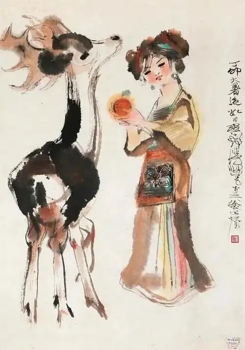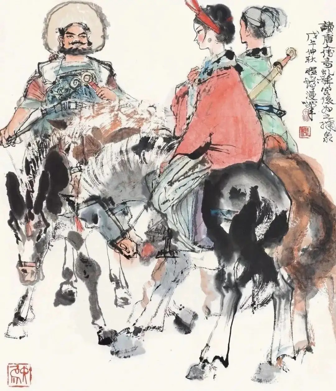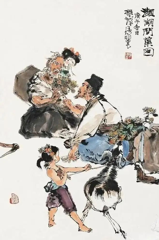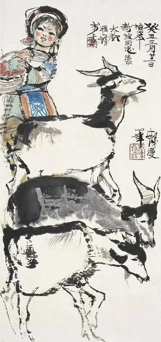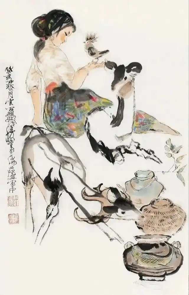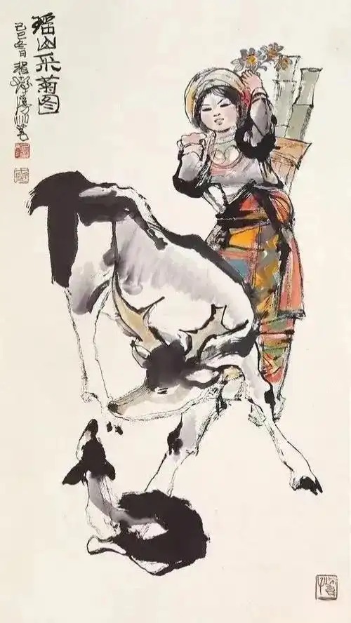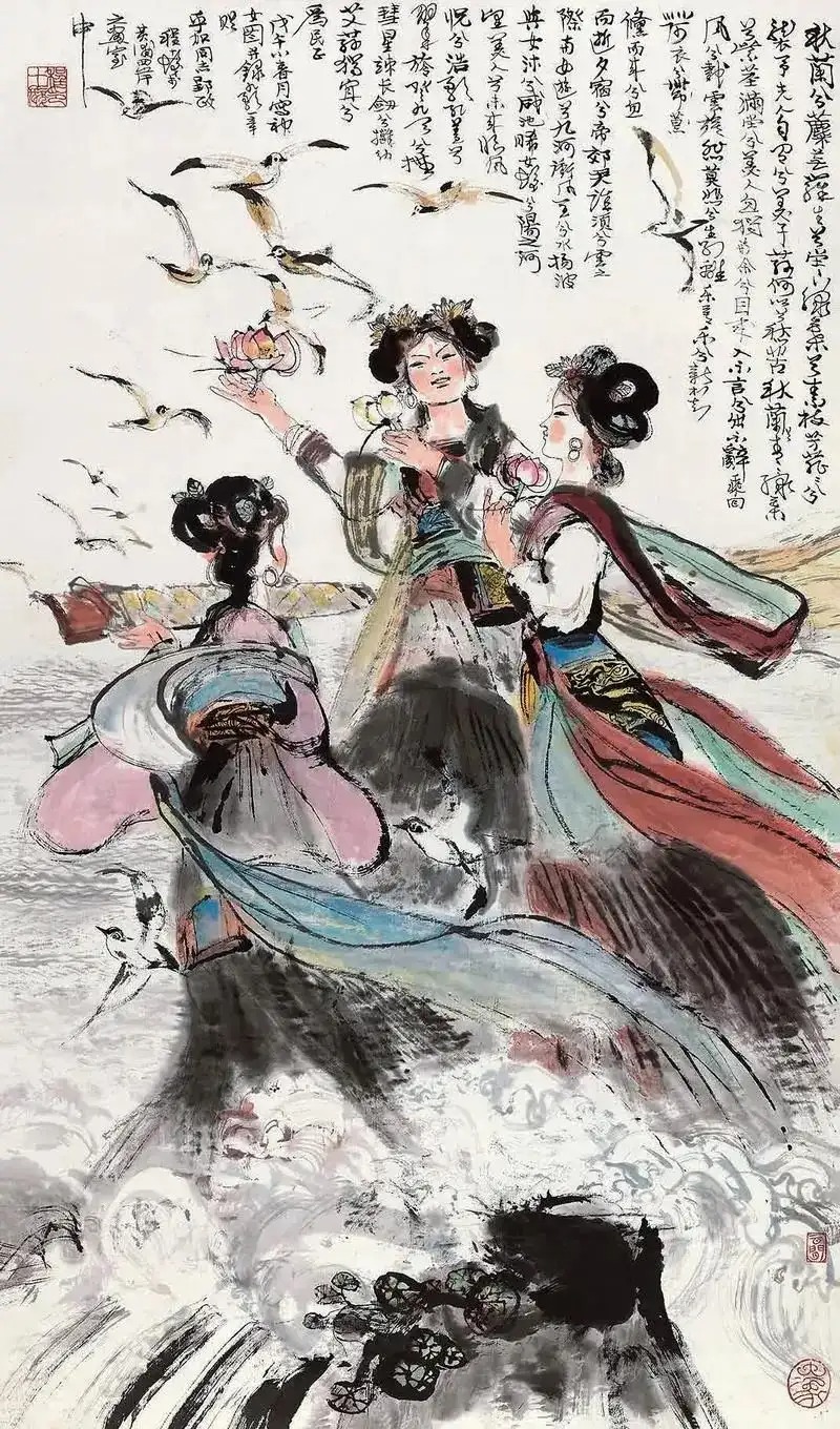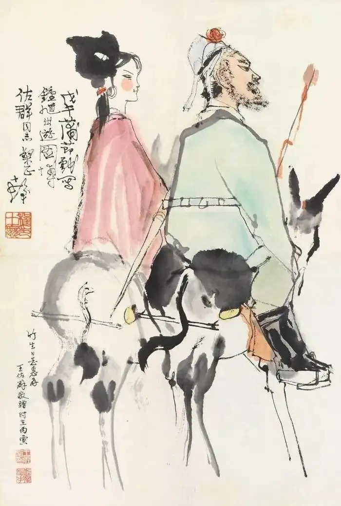 程十发(1921-2007),中国近现代美术史上独树一帜的艺术大师,其人物画以灵动飘逸的线条、明快鲜活的色彩和充满生命力的艺术表达,成为二十世纪中国画转型的重要标志。本文精选其100幅经典人物画作,带您走进这位海派艺术巨匠的笔墨世界。程十发笔下的少数民族形象,打破了传统工笔的拘谨,以写意线条勾勒出西南边陲的浪漫风情。《傣族少女》中,少女身姿如风中细柳,简练的墨色长裙与朱砂点缀的头饰形成鲜明对比,传递出热带雨林的生机;《高原之春》里藏族少女的羊皮袄以枯笔皴擦出粗犷质感,面颊的胭脂色却透出江南水乡的温婉,这正是画家'以线造型,以色传情'理念的完美诠释。在《芦笙舞》三联画中,画家大胆采用俯瞰视角,将苗家儿女的舞动身姿转化为流动的线条符号,笙管与裙摆的弧线相互呼应,构成视觉的交响乐。而《火把节》则运用泼墨技法渲染夜色,跳跃的橙色火光照亮彝族汉子的轮廓,展现出原始生命的张力。程十发对传统题材的再造令人耳目一新。《李太白醉酒图》突破历代白描范式,以倾斜构图表现诗仙的醉态,袍服上的飞白笔触仿佛带着酒香墨气;《钟馗夜巡图》中的捉鬼天师不再怒目圆睁,微醺的神态与蜷缩的小鬼构成戏剧性画面,透出画家对民间传说的幽默解读。《红楼十二钗》系列堪称文人画现代转型的典范。史湘云醉卧芍药裀的场景,花瓣以没骨法点染,人物衣纹却融入书法飞白笔意,传统工笔与写意的界限在此消弭。黛玉葬花的背影处理更具深意,大面积留白中仅以飘落的桃花暗示泪痕,开创了'以虚写哀'的新境。在现实题材创作中,程十发展现出艺术家的人文关怀。《采药姑娘》以赭石与花青的撞色表现山间晨雾,少女背篓中的草药以篆书笔法写出,将劳动之美提升至美学境界;《渔村新事》采用连环画式构图,渔民们修理渔网的动态通过衣纹走向自然串联,眼角笑纹的微妙刻画胜过千言万语。《茶馆记事》四条屏堪称市井生活百科全书,老茶客的紫砂壶、说书人的折扇、孩童手中的糖画,每个细节都是时代印记。画家独创的'游丝描'在此臻于化境,细若发丝的线条勾勒出百态人生,让水墨画拥有了油画的叙事容量。晚年的程十发开启更具突破性的艺术实验。《敦煌飞天变奏曲》将壁画元素解构重组,菩萨衣带化作几何色块,却通过墨色浓淡保持东方韵味;《马戏团》系列借鉴立体主义手法,小丑的服装碎片化处理中仍可见书法运笔的节奏。在《自画像》中,画家以朱砂勾勒面部轮廓,背景的西洋红与群青碰撞出超现实意境,题跋'我与我周旋久,宁作我'的碑体书法,完成传统文人画精神内核的现代转译。这种'借西润中'的探索,为水墨人物画开辟了新航道。从雪域高原到江南水乡,从历史长河到烟火人间,程十发用100幅画作构建起一个贯通古今的艺术宇宙。他的笔墨既是传统的守护者,又是创新的破壁人,那些舞动的线条与跳跃的色彩,至今仍在诉说着'笔墨当随时代'的真谛。当我们驻足这些画作前,不仅能看见人物形象的生动气韵,更能触摸到一个时代文化转型的脉搏跳动。