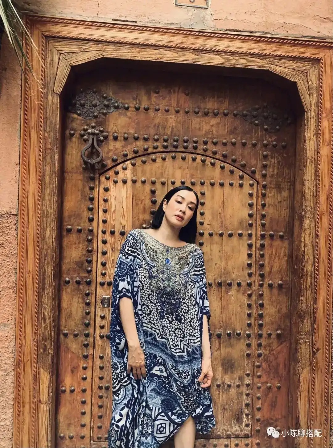 在钟丽缇的搭配之中,也有并不适合大家去学习的,对此可做错误搭配示范来让大家感受到如何穿松。例如这一身民族风大圆领阔版连衣裙,虽然花纹极具特色,但是过宽的圆领略有颓感,给人以一种没有精气神的感觉。无腰线的设计加上宽大的风格让身材毫无线条可言,虽是将赘肉都藏起来了,但是这种过松的搭配真的会无比放大你的胖!▼