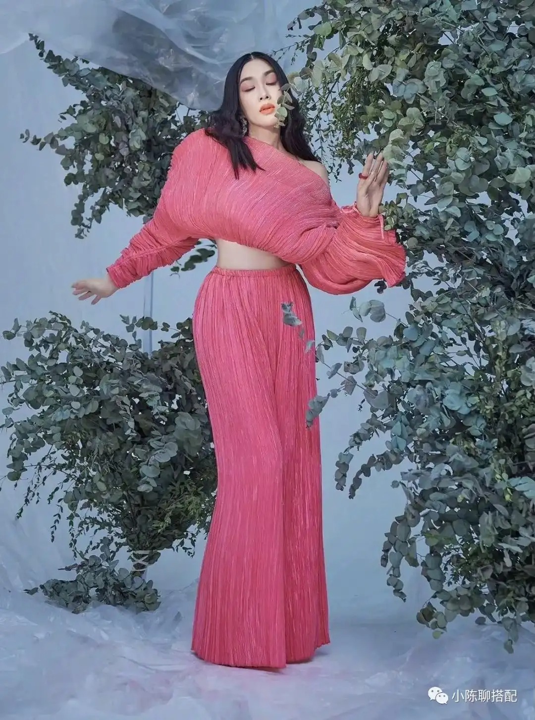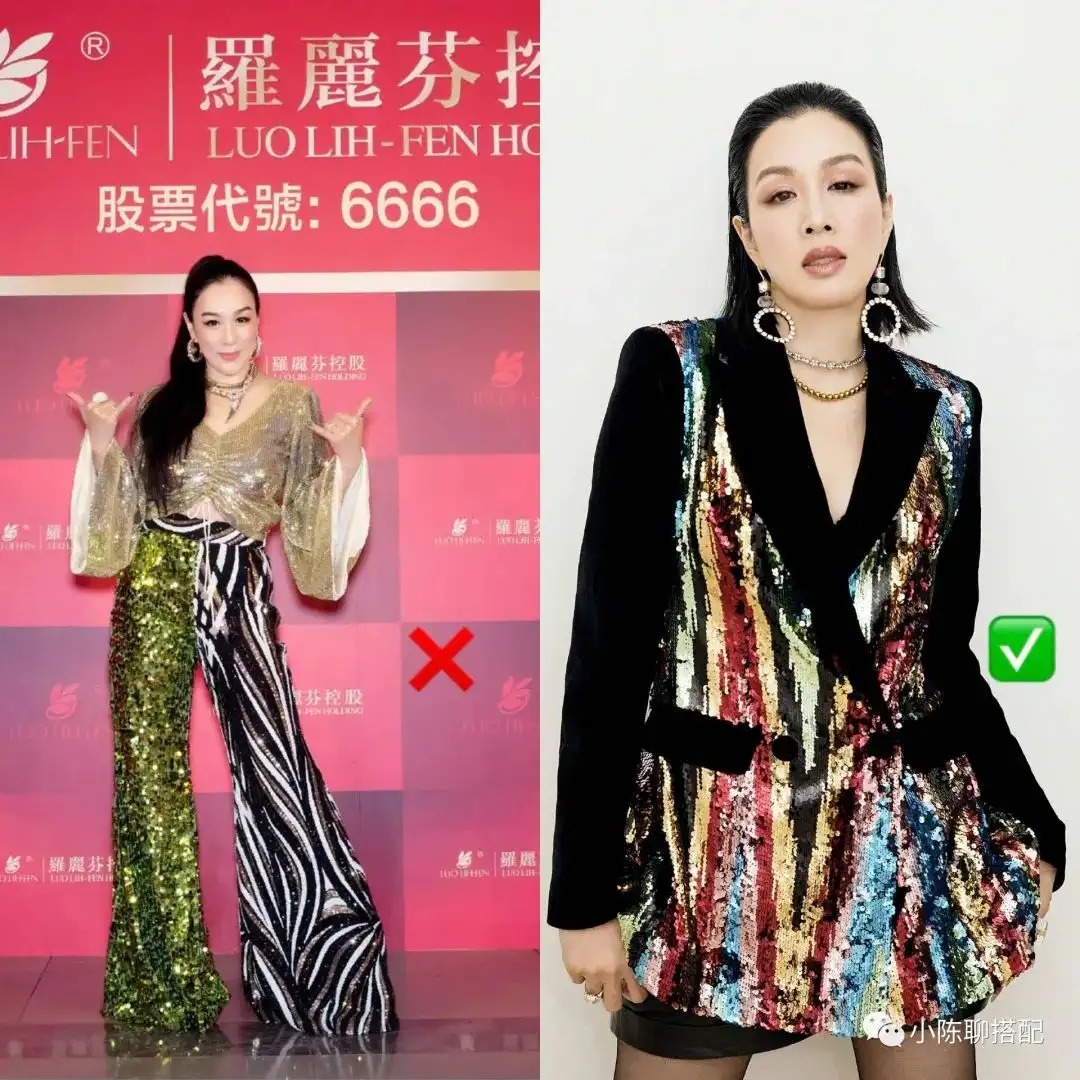 穿松如何穿的好看又时尚呢?可以看看钟丽缇这身搭配,以oversized 版型的亮片拼接西装打造完美空间感,西装自身走线可以弥补服装过大的宽松感,与此同时又给予了充分的空间来隐藏小肚子上的赘肉!需要大家注意的就是在穿松的过程中要有度,一般穿松可以选择上半身或是下半身的松。可千万不要同时穿松,就像钟丽缇这身蝴蝶袖上衣加亮片拼接喇叭裤,垂坠的袖口加入宽松的裤角都给造型带来了极大的负担!▼