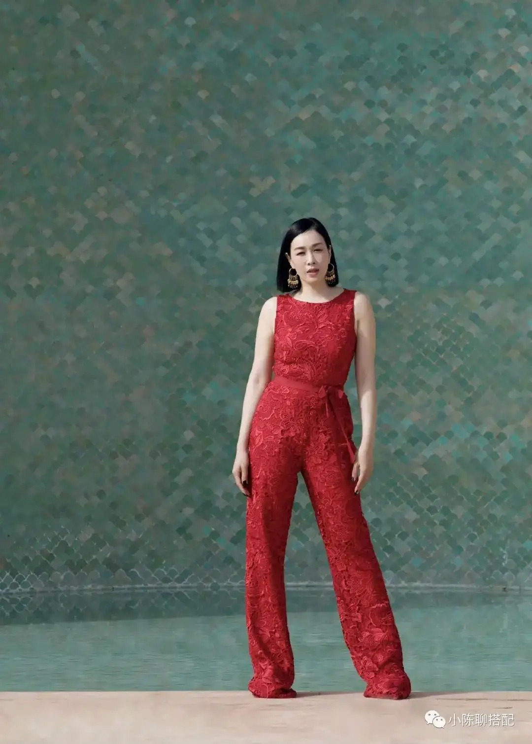 在钟丽缇这身无袖雕花连体裤中,修身的版型加上过度的花纹,更显胯宽腰粗!本想以收腰设计来显瘦,但是张力十足的红色加上满满当当的钩花,足以把身材的胖显露到极致,这样的穿紧就是典型的错误穿法!▼