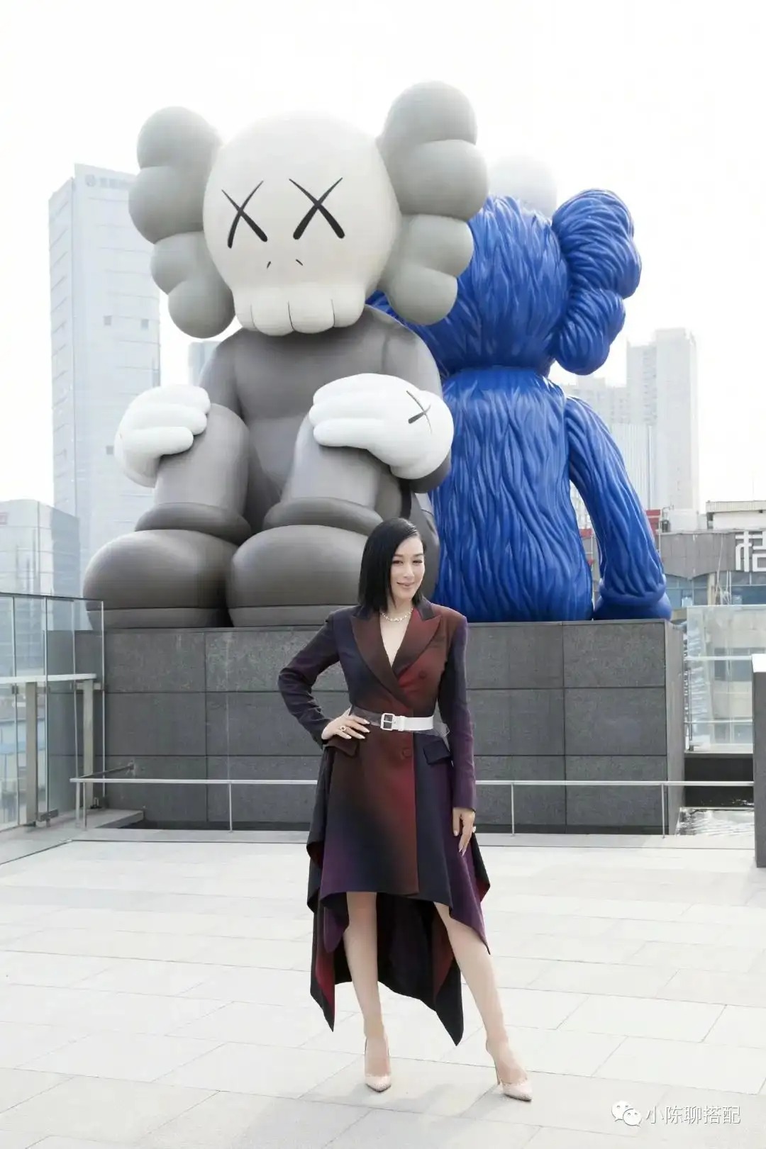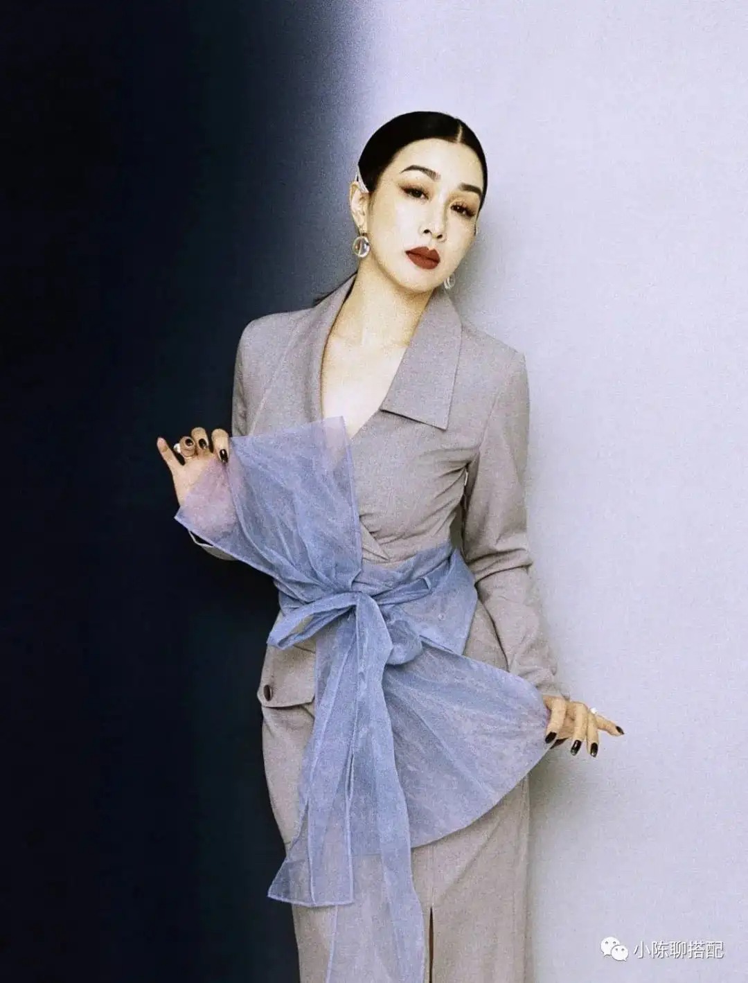 在钟丽缇的穿搭中,比较令人亮眼的造型多半都是松紧结合的造型,例如这身不规则收腰西装款连衣裙,上半身收紧腰身,V领留白,下半身阔摆A字,上紧下松的造型,高级而又不失个性!▼