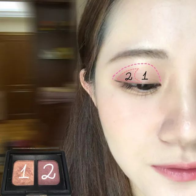 再用深一号的同色系眼影涂在眼皮的1/3处(空出眼头)