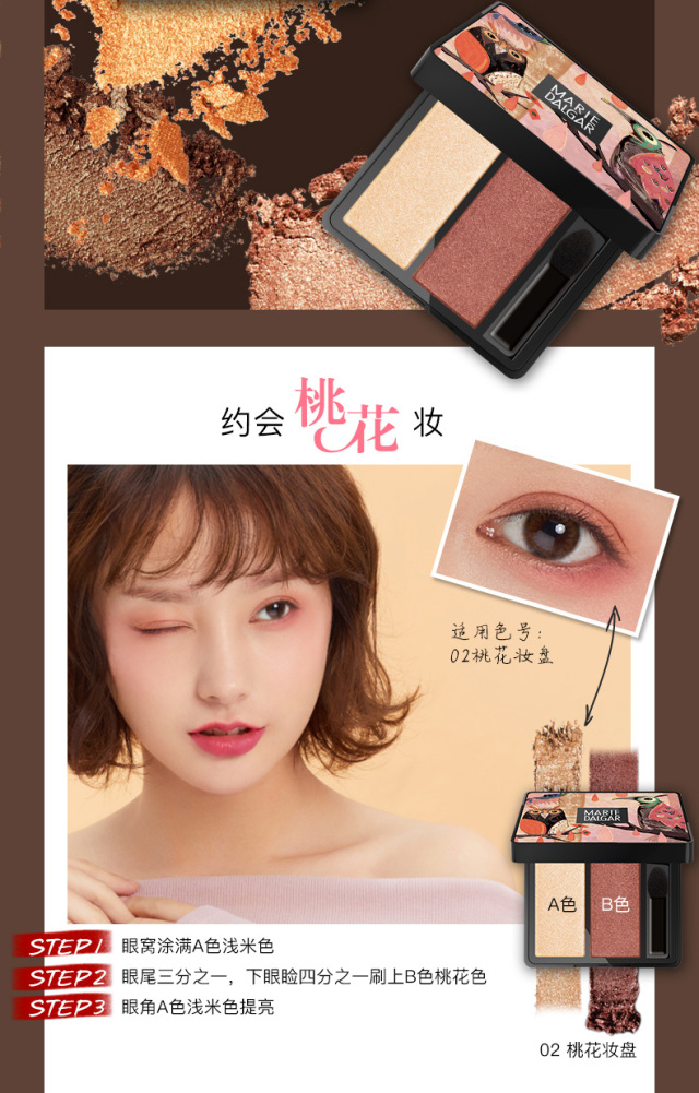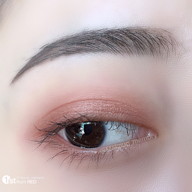 先用相对浅的一个颜色铺满眼窝,再用较深的颜色在眼尾处加强。晕染刷上下轻扫自然过渡,上眼影就完成了。