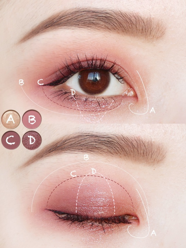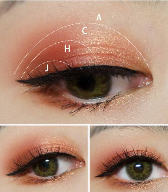比三色眼影的画法多加一个珠光色,会让眼睛更加有神。