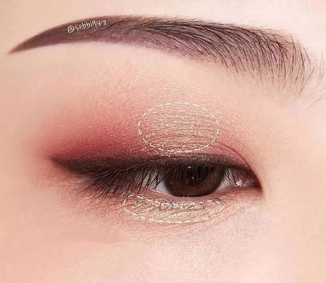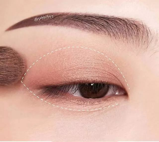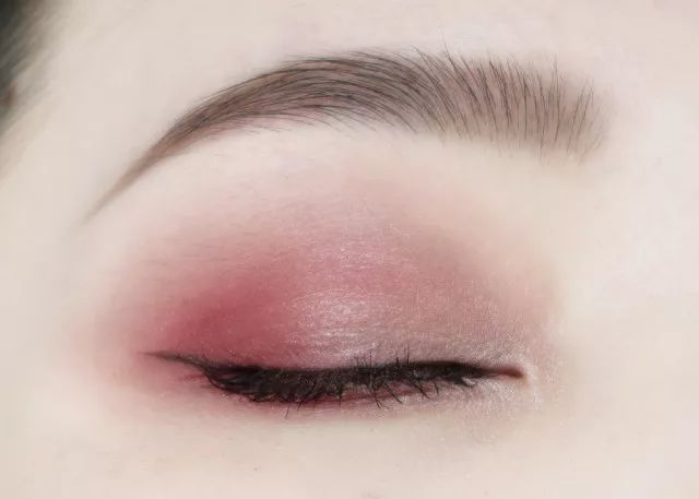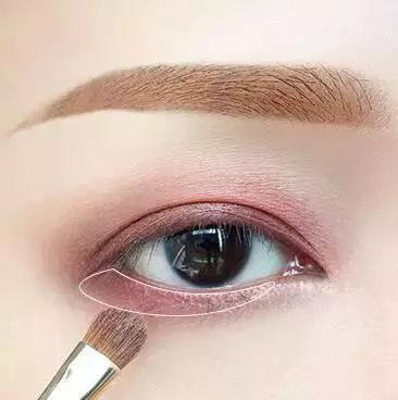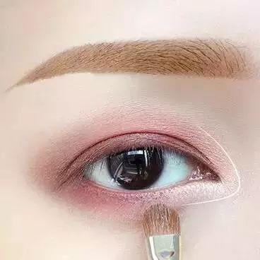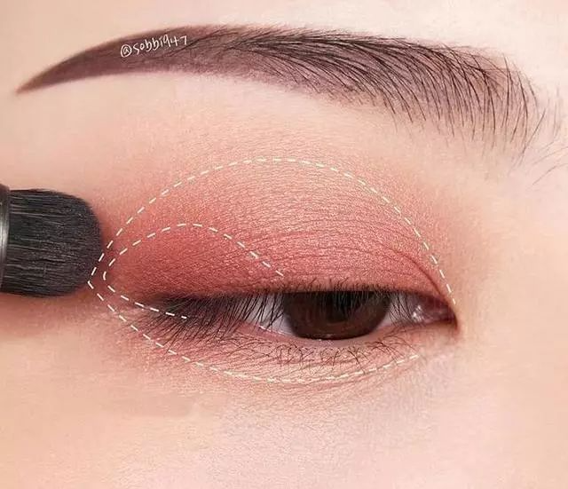 单色眼影想要画出层次感,第一遍在眼窝处均匀晕染开,再在眼尾处三角区加强一下。有加长眼尾的效果,也可以更好的调整眼型,让眼睛又长又深邃。
