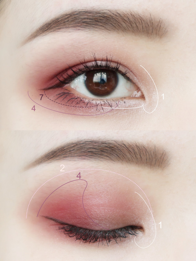 下眼影先用浅色涂在整个卧蚕处,再用深色涂在眼尾小三角区域,与上眼影自然融合。