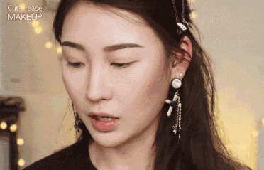 白色系珠光加在眼头位置,眼妆看起来非常干净,给人楚楚可怜的感觉,类似高光的效果