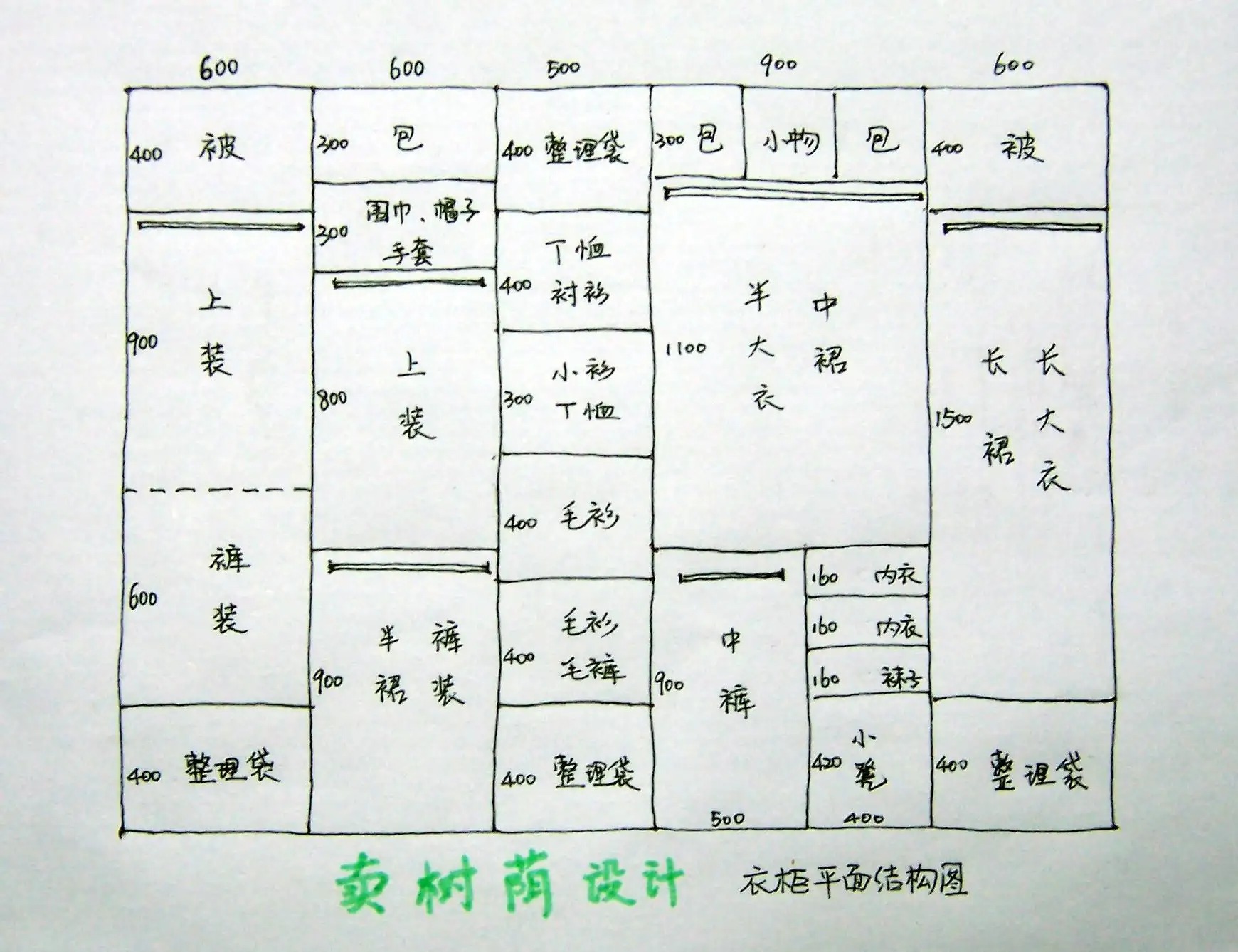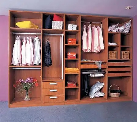 叠放区——以叠放衣物为主;挂放区——以挂放衣物为主,又分短衣空间、中长衣空间、长衣空间和挂裤子空间;杂物区、多功能区——放置的物品视个人要求而定,可以放些行李箱之类,如有承重要求,一般设计在柜子最下层,以免隔板变形;大件区——基本上以换季的衣物和被子为主,也可置放整理箱。