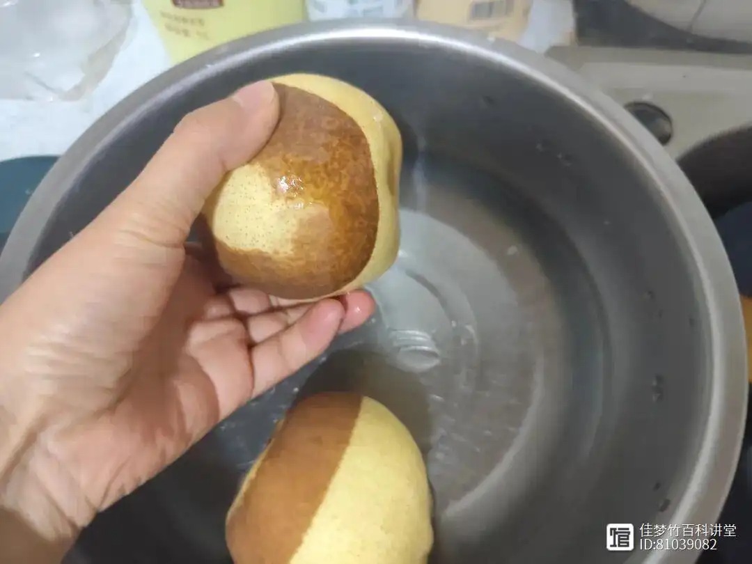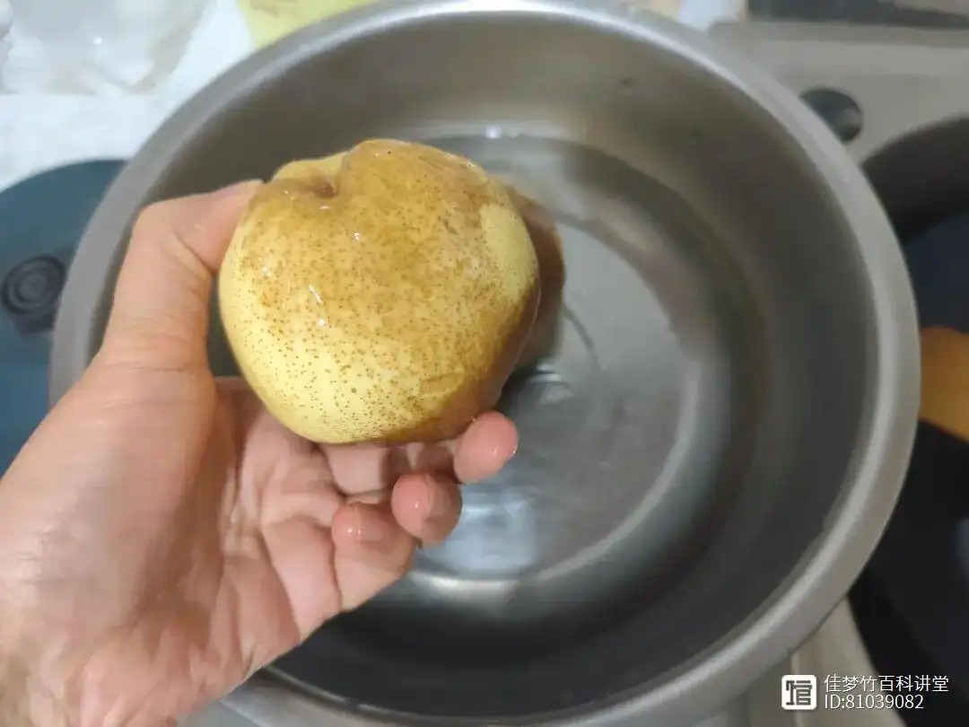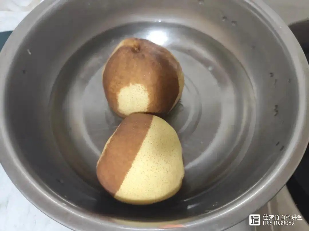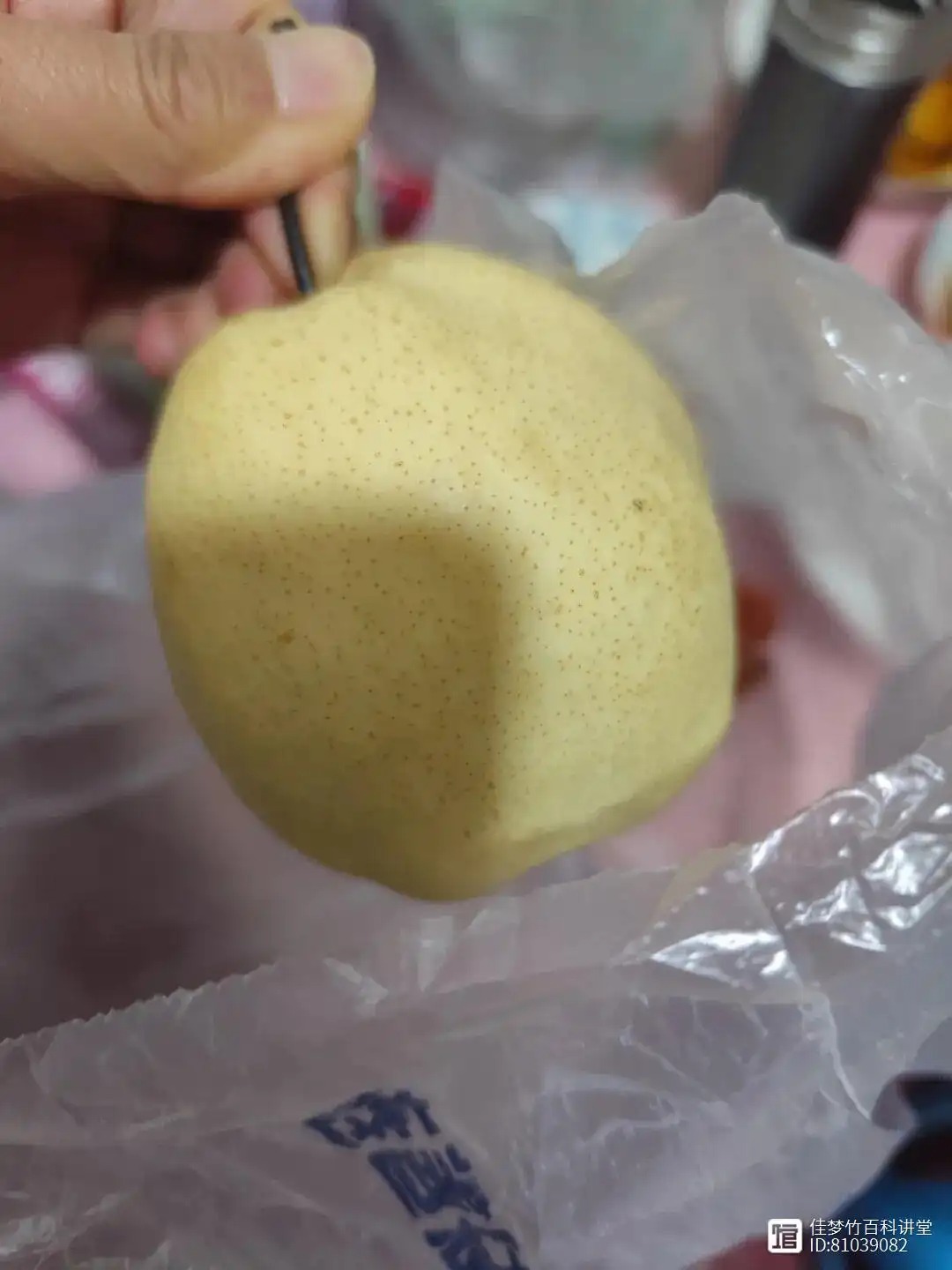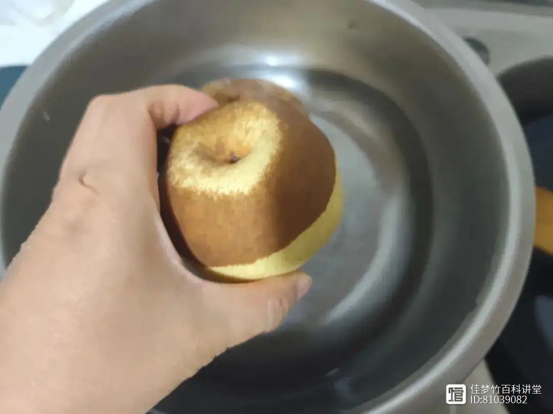 梨外面有一层纸包裹着,打开后颜色很正黄色。考虑到冬天天冷,直接用清水洗完吃的话担心拉肚子。于是,我给盆里倒了点热水让梨泡一泡再吃的话就不那么冰凉了。热水泡了一会,准备拿梨吃的时候发现梨的皮变色了