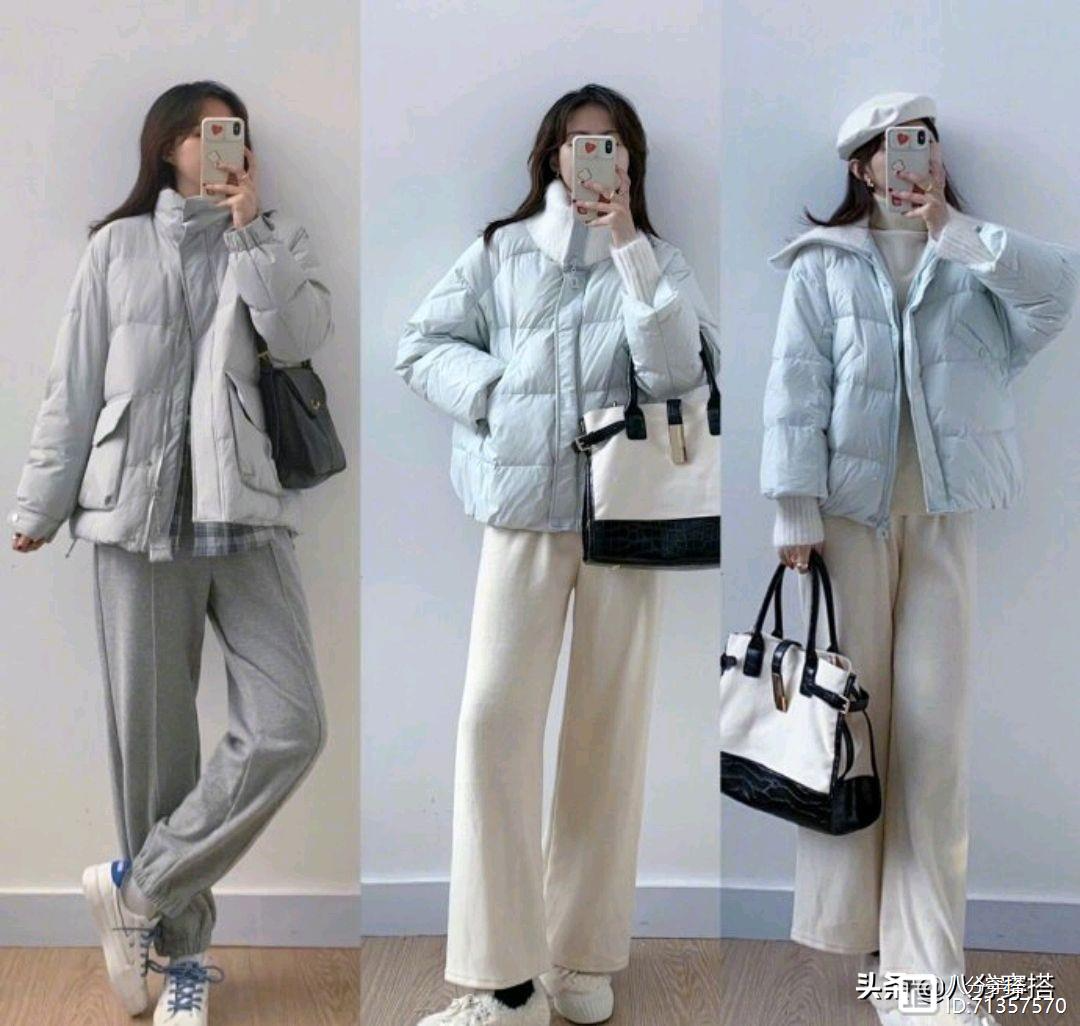 浅灰色的服装中性儒雅,包容性强不易出错,穿搭当中会运用到一些过于跳跃的颜色和元素的时候,不妨借助大面积的灰色来中和,会有意想不到的效果呢,还有清新脱俗的浅蓝色,超级温柔,给人的感觉也是相当清爽的,和一般的羽绒服搭配方式一样,内搭T恤,卫衣或者是针织衫,下半身阔腿裤,紧身裤都不出错,简单清爽,舒适自然,轻松穿出少女的娇俏和安静温柔魅力。
