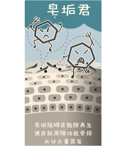 而那些年洗到'咯吱咯吱'的事实上是皂垢残留在皮肤的现象,皂垢是脂肪酸和金属离子的合体产物,牢牢抓着你脸部的皮肤不放手,水也难以冲走,尤其是合成洗剂,更是越积越多不断积聚在皮肤上。所以洗脸后的一段时间由于皮脂膜无法修复重新生成,皮肤内的水分就大量蒸发,脸上才会感觉紧绷(也是现代人总误以为自己干皮的原因之一)。同时由于皂垢的阻隔作用,就算拍了化妆水也不容易吸收,也就产生了仿佛越补水越干燥的现象。