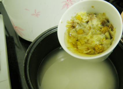 洗米后,把泡好的菊花水到进去一起煮,菊花有清热解毒,祛瘀的作用,和饭煮后吃,可以清热去火哦~
