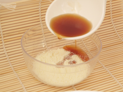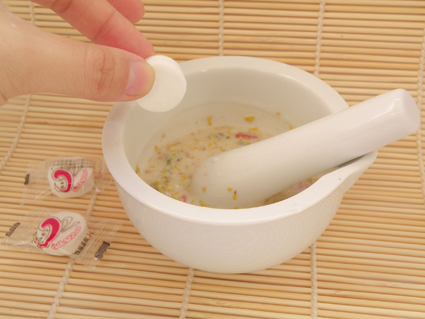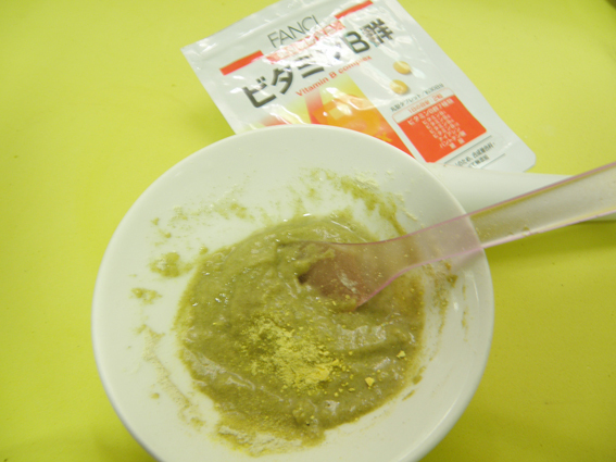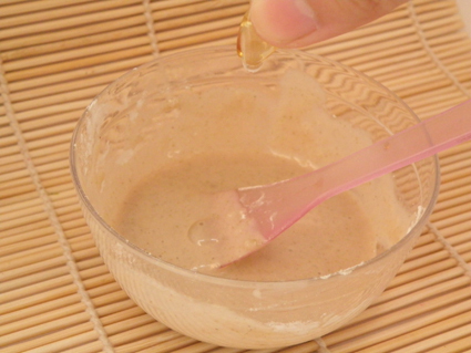 到入荷叶水,一起搅拌成糊~然后放一颗维生素E,可以起到滋养美容功效。