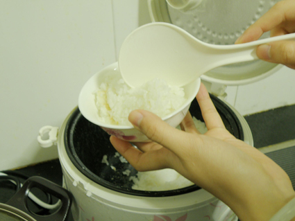 勺一碗饭~~嘿嘿,香喷喷的~还飘着菊花的香味~~接着捏成小小的谜团~~