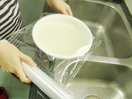 由于热气会容易跑掉,所以盖上保鲜膜哦,可以持续比较久。哈哈~那个舒服
