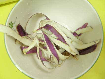 O(∩_∩)O~茄子削皮,简单点的可以直接把茄子皮敷脸上,戳一戳也可以把茄子榨汁,加上面粉
