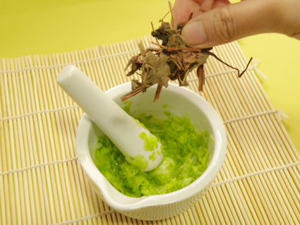 然后加入几根鱼腥草,一起剁烂,然后扑到面膜纸上面,直接敷脸