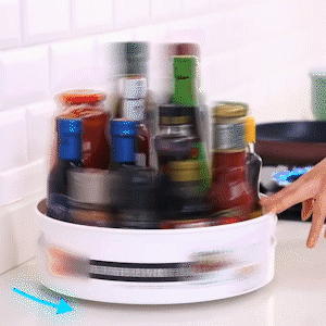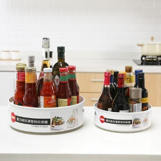 旋转式调料架,可放在台面,也可放在橱柜内。在厨房可充当调料旋转架使用,在卧室可当做化妆品收纳架~