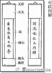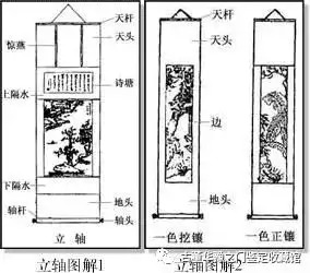 ①条幅,因是垂直悬挂,又称挂轴,或轴。自上而下包括天杆、天头、惊燕、上隔水、圈档、画心、下隔水、地头、地杆、轴头等,一般为天头大、地头小。