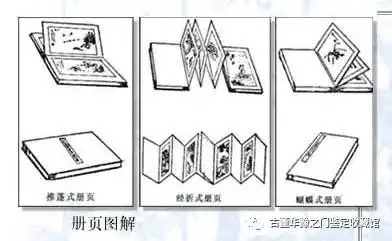 ③册页,首尾相连、折叠而成,其形式类似画册,每页一幅画,或一画一跋,首尾为硬面包锦,内有边、画心、分心等。册页有多种样式,其中左右翻折,向右开版的称蝴蝶装,上下翻折,向上开版的为推蓬装等。另外装裱幅式还有屏条、对联、横披等。