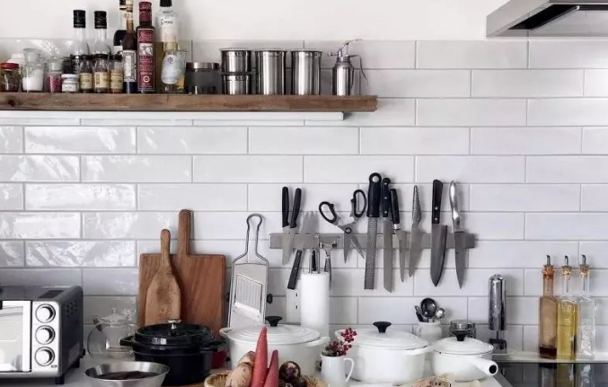 墙面收纳不仅可以用来收据刀具,还可以用来收纳锅铲等小物件。