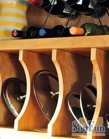 是最为简单的收纳设计,但是非常实用。简简单单的一两层隔板便能划分出灶台下面的空间,层数完全取决于个人的需要。因为隔板高度可灵活调节,所以用来储藏蒸锅或不锈钢盆等较大物品非常合适。