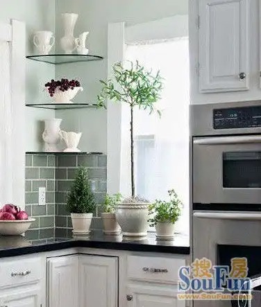 角落的三层式玻璃隔板,用来放咖啡、茶叶罐、烹饪书和装饰品既实用又漂亮。