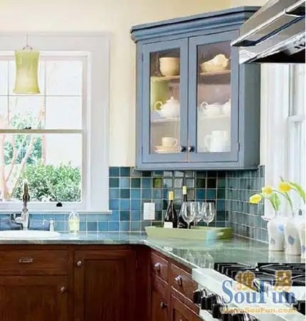 尽管三角吊柜牺牲了一部分立方空间,但让我们更容易够到柜子里里面的东西,而且给厨房提供了一个展示餐具收藏的最佳角度。