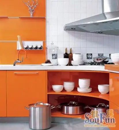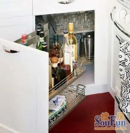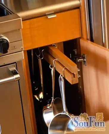 现在,大部分厨房都做了整体吊柜和地柜,吊柜和地柜之间还加上了悬挂式金属网篮,用以放置调料和筷勺。已经具备这样的硬件设施,只需在收纳时注意“最称手原则”——最常用的餐器、厨具、调料和原材料,应集中摆放在双眼到双膝之间的范围,很少用到的收纳在吊柜最高层和地柜最底层。