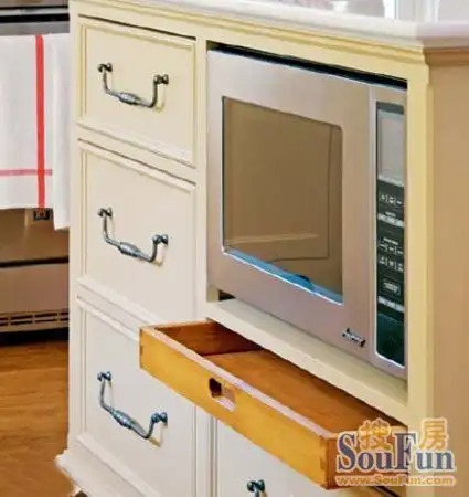 利用微波炉下方闲置的空当,插装滑动托架,它既可以充当微波炉下的活动台面,或者干脆取下来当托盘使用。