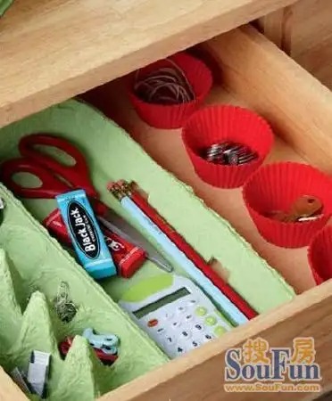 抽屉内部的合理分区完全可以利用厨房里的小玩意,比如蛋糕纸托、装鸡蛋的纸壳板等,那他们当抽屉内的分隔收纳橡皮筋、小夹子之类的东西。